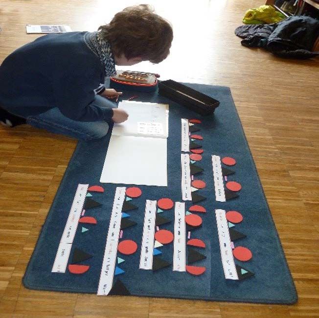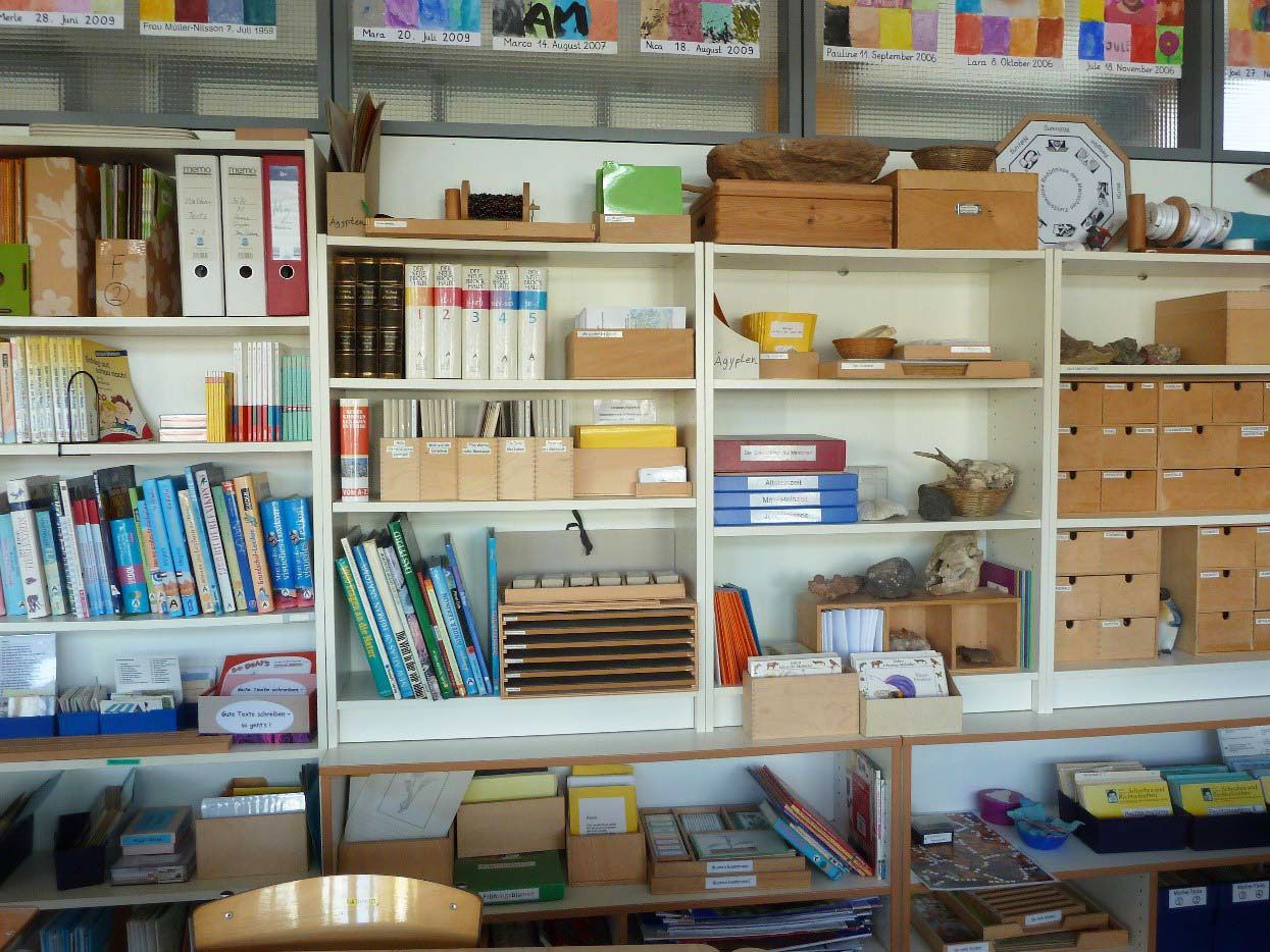 Die eingesetzten Montessori-Materialien sind so konzipiert, dass die Kinder selbstständig weiterarbeiten können und sich selbst kontrollieren. Am Ende der täglichen Freiarbeit präsentieren Kinder häufig die erzielten Ergebnisse vor der Klasse.